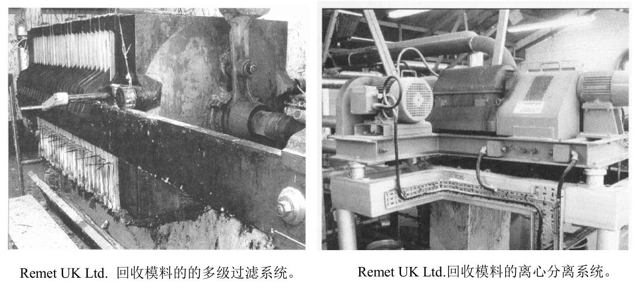 目前,無論外,大多數(shù)精鑄廠家采用蒸汽脫蠟法。脫出的模料中常含有質(zhì)量分?jǐn)?shù) 5%~15%的水分, 15%~35%的填料(對填料蠟),和大約 0.5% 的陶瓷類夾雜物 [2] 。回收處理的關(guān)鍵是將這些陶瓷類夾雜物除去,因?yàn)樗鼈兪悄A现袣埩艋曳值闹饕獊碓础.?dāng)然其他一些無機(jī)化合物,諸如氧化鐵之類,也是必須嚴(yán)格控制的。傳統(tǒng)的模料回收方法是沉降法。這種方法處理過程耗時(shí)長,而且沉降物不密實(shí),收得率也不高。更好的方法是采用高效的加壓多級過濾或/和離心分離法,以加速處理過程并獲得更純凈的模料。圖 1-1 和圖 1-2 所示分別為英國Remet UK Ltd.的過濾和離心分離系統(tǒng) [2] 。不難看出,當(dāng)前國外流行的模料回收處理方法,其技術(shù)關(guān)鍵就在這種多級過濾凈化系統(tǒng)。經(jīng)過過濾的模料通常具有良好的物理性能,灰分含量可降 0.05%甚 0.03%以下,可與無填料的新蠟媲美,直接用作民用精鑄件模樣蠟或澆道蠟。如再補(bǔ)充一些原材料和附加物(通常是添加某些烴蠟),則可進(jìn)一步獲得符合標(biāo)準(zhǔn)規(guī)格或用戶要求的再生蠟。回收蠟中如再加入一些新蠟、樹脂和填料,也可制成某些精鑄件使用的填料蠟。采用離心分離所得回收模料中灰分含量通常要比過濾處理的高,經(jīng)常達(dá) 0.1%甚更高。