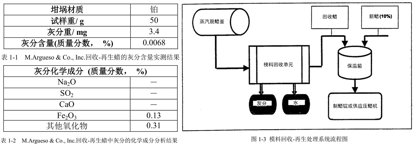 M.Argueso & Co., Inc.開發(fā)成功的專利技術(shù) ‘Tech-Clean’ [發(fā)表于 Incast 2000 (9)], 可使回收模料中灰分含量減少 74%,達(dá)到 0.03%以下,經(jīng)常保持在 0.003%~0.005%范圍 。灰分中的SiO 2 、Na 2 O、SO 2 、CaO、 Fe 2 O 3 等氧化物含量均大幅下降(表 1-2) [4] 。從而達(dá)到或接近新蠟的標(biāo)準(zhǔn)。